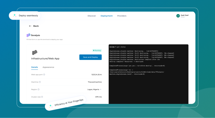 CLOAK is a B2B cloud-agnostic application that allows users to deploy products and machines. The target audience includes organizations and developers who need to deploy products quickly and efficiently. The main challenge for the application was to provide a seamless and customizable deployment process for the end users.